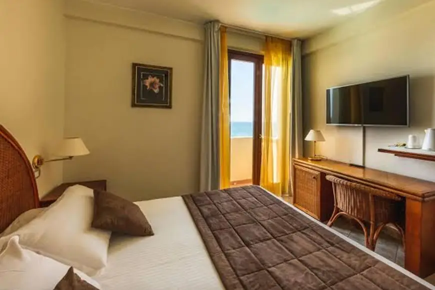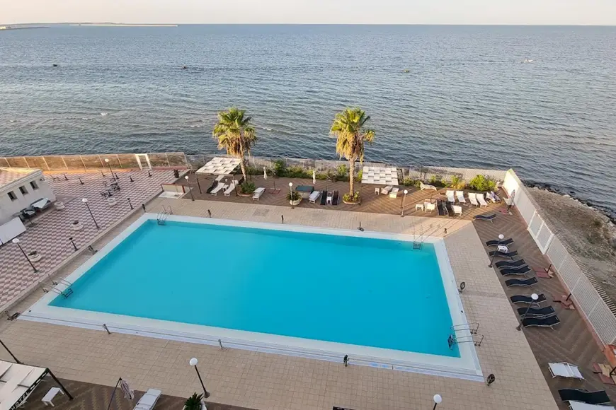 L’hotel si affaccia direttamente sul Mar Ionio, con accesso immediato alla spiaggia sabbiosa di Lido Azzurro. Anche se il litorale è pubblico, gli ospiti possono usufruire di un’area solarium con lettini e ombrelloni nelle vicinanze della struttura, così da vivere la giornata tra mare, relax e panorami unici.